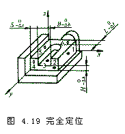 4.3.2 由工件加工要求确定工件应限制的自由度数 按照工件加工要求确定工件必须限制的自由度是工件定位中应解决的首要问题。 (齿轮, 齿轮箱, 汽车齿轮, gears, gearboxes 1)完全定位 若工件在夹具中定位,六个自由度都被限制,则称为完全定位。如图4.19所示,由于被加工表面在三个坐标方向都由尺寸要求,故要求限制工件的六个自由度;