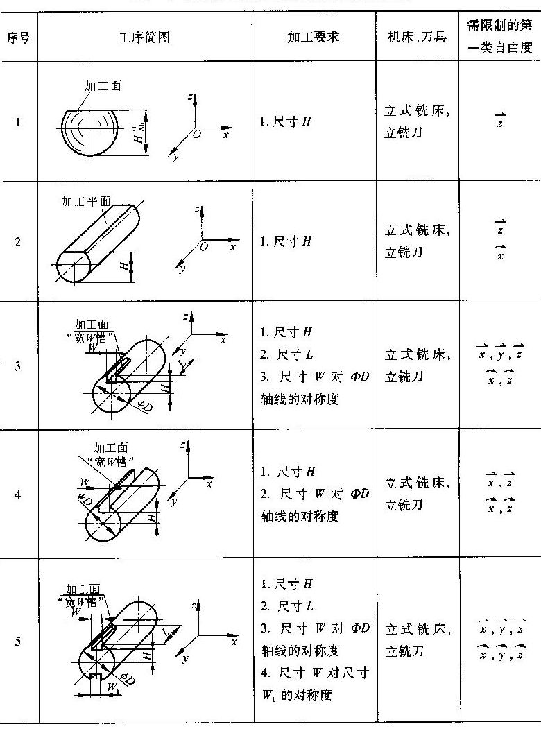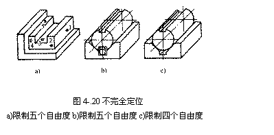 (2)不完全定位 若工件在夹具中定位,六个自由度没有被全部限制,则称为不完全定位。如图 4.20所示,由于工件的加工要求和结构形状特点,在工件定位时允许某些方向的自由度不被限制。有时,也无法限制某些方向的自由度。如图4.20中的y方向移动自由度允许不限制;如图 4.20(c)中在圆柱体上铣槽时无法也没有必要限制其绕自身回转轴线的自由度。