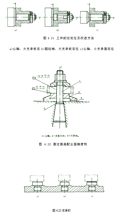 (3)欠定位 根据零件加工要求应限制的自由度未被限制的现象称为欠定位。欠定位在零件加工中是不允许出现的。 (4)过定位 如果某一个自由度同时被两个以上的定位元件来限制,这种定位方式称为过定位或重复定位。过定位情况一般应避免,如图 4.21所示。因此当出现过定位时,应采取有效的措施 消除或减小过定位的不良影响。消除或减小过定位的不良影响一般有如下两种措施。 齿轮, 齿轮箱, 汽车齿轮, gears, gearboxes 1)改变定位装置结构 如图4.21所示 2)提高工件和夹具有关表面的位置精度 如图4.22所示齿坯定位的示例,齿坯在长销和大平面定位,长销限制