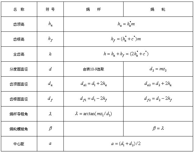 1)模数和压力角 蜗杆传动的设计计算都是以中间平面内的参数和几何关系为标准。 在中间平面上,蜗轮与蜗杆的啮合相当于渐开线齿轮与齿条的啮合。 ma1=mt2=m αa1=αt2=200 γ=β 2)蜗杆分度圆直径d1及蜗杆直径系数q 3)蜗杆螺旋线升角 z1、q已知时,升角即为定值。 4)蜗杆的头数z1和蜗轮的齿数z2 可参考表。 5)蜗杆传动传动比i i=n1/n2=z2/z1 6)蜗杆传动的中心距a a=(d1+d2)/2=m(q+z2)/2 3.蜗杆传动的几何尺寸