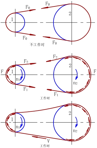 14.3 带传动的工作能力分析 14.3.1 带传动的受力分析 把一根或多根环形V带张紧套装在主动轮1和从动轮2上,使挠性带与带轮的接触面间产生压力。工作时,靠带与带轮间的摩擦力传递运动与动力。在一定的条件下,摩擦力有一极限值,如果工作阻力超过了摩擦力的极限值,带将在带轮面上打滑,带传动将不能正常工作。