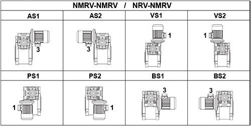 The position of the 1st reducer with respect to the 2nd gear reducer depends on the versions. Unless specified at the time of order, combination groups will be supplied in version BS2.The specified mounting position refers to the 2nd gear reducer.